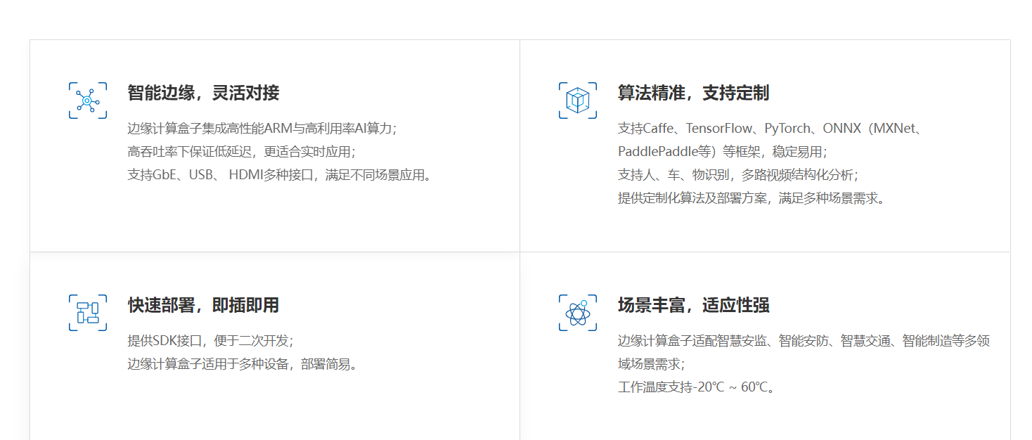 總的來說,AI邊緣盒子是一種集成了AI芯片和AI算法的智能設備。通過邊緣計算和人工智能技術,可以實現(xiàn)對圖像的實時分析和識別,可以輕松實現(xiàn)不同領域的安防應用需求,同樣也可以大幅提升工作效率,減少人力和物力的投入成本。