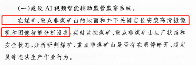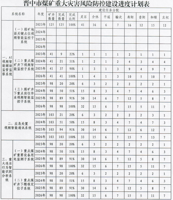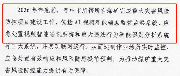 本次晉應(yīng)急發(fā)〔2023〕65號文件主要針對晉中市所有煤礦完成重大災(zāi)害風(fēng)險(xiǎn)防控項(xiàng)目建設(shè)工作,為達(dá)到作業(yè)場所實(shí)時(shí)監(jiān)控、應(yīng)急處置有效響應(yīng)和風(fēng)險(xiǎn)隱患提前預(yù)判,要求在2026年完成全市煤礦建設(shè)AI視頻智能輔助監(jiān)管監(jiān)察系統(tǒng)、應(yīng)急處置視頻智能通訊錄和重大違法行為智能識別分析系統(tǒng)。