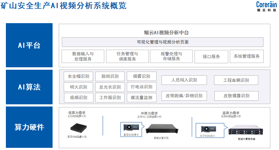 為加強(qiáng)煤礦安全風(fēng)險(xiǎn)防范,建設(shè)AI視頻識別系統(tǒng),要求在煤礦的地面和井下關(guān)鍵點(diǎn)安裝攝像機(jī)和圖像智能分析設(shè)備,對煤礦地面的人、設(shè)備、環(huán)境因素所存在的安全隱患實(shí)時(shí)監(jiān)測分析;在煤礦調(diào)度室可監(jiān)控值班人員是否離崗、睡崗等實(shí)現(xiàn)加快應(yīng)急處置響應(yīng)速度;面對重點(diǎn)煤礦井下作業(yè)人員實(shí)時(shí)精準(zhǔn)定位,對井下人員進(jìn)入危險(xiǎn)區(qū)域及時(shí)報(bào)警提醒。