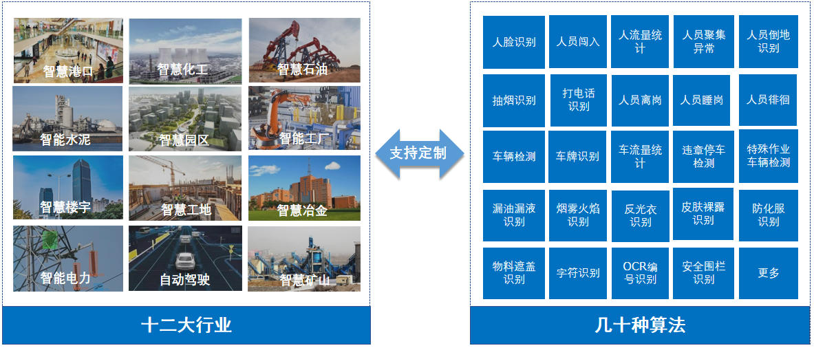 視頻智能分析算法是為了幫助客戶解決場(chǎng)景問(wèn)題而生,在企業(yè)安防領(lǐng)域,利用安全帽識(shí)別、工服識(shí)別、人員闖入、煙火識(shí)別、反光衣識(shí)別、打電話識(shí)別、抽煙識(shí)別、摔倒識(shí)別等各行業(yè)通用的AI算法,搭配皮膚裸露識(shí)別、變電站隔離開(kāi)關(guān)狀態(tài)識(shí)別、漏油識(shí)別、氣瓶臥倒識(shí)別、靜電釋放時(shí)間檢測(cè)、滅火器識(shí)別、氣瓶臥倒識(shí)別、絕緣手套識(shí)別、皮帶異物識(shí)別、皮帶跑偏識(shí)別、糧面異動(dòng)識(shí)別等多種行業(yè)特定算法。通過(guò)對(duì)視頻圖像進(jìn)行處理和分析,可對(duì)異常違規(guī)行為和環(huán)境風(fēng)險(xiǎn)進(jìn)行識(shí)別,發(fā)現(xiàn)安全隱患立即報(bào)警,提高生產(chǎn)管理的精度和效率。