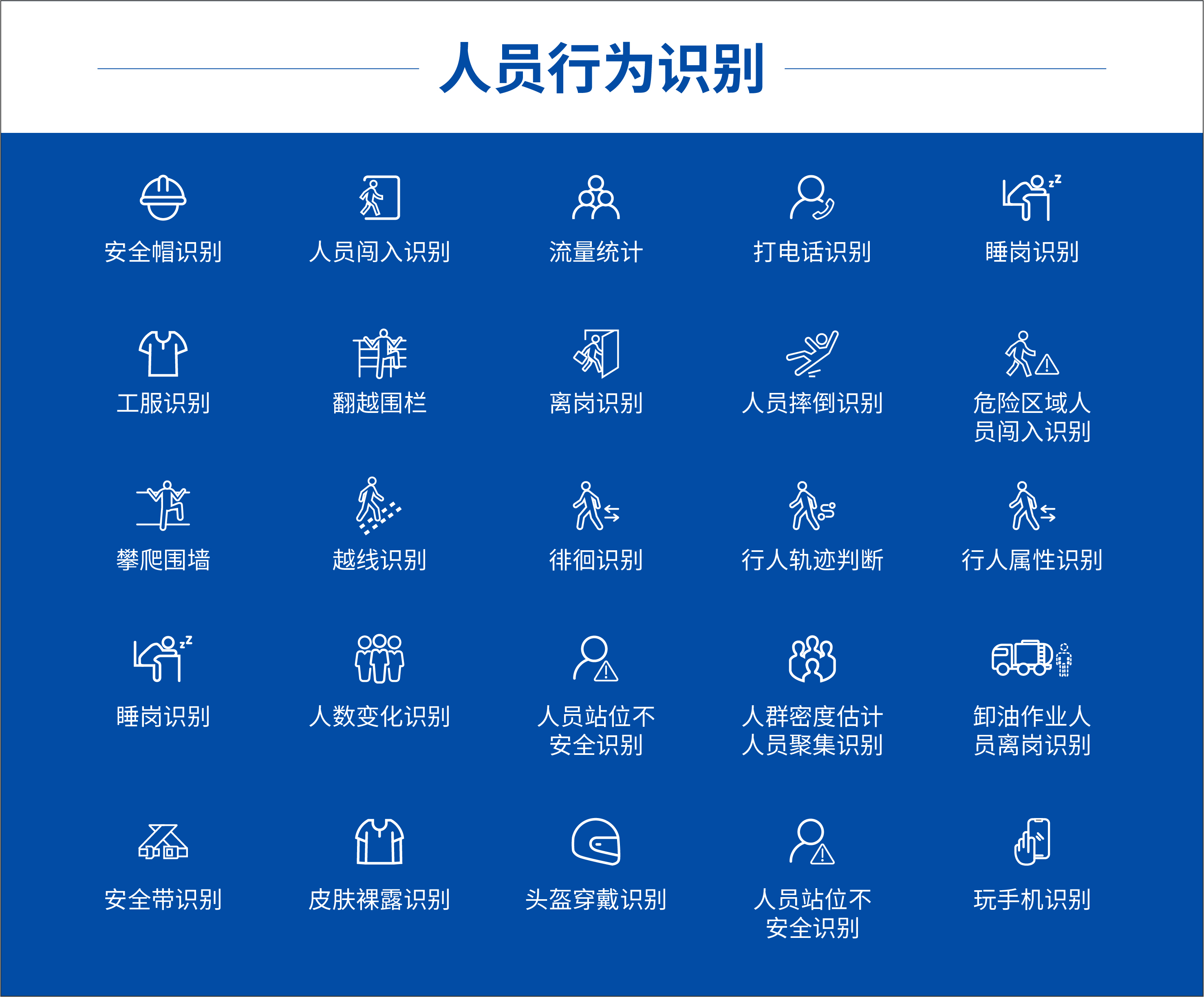 視頻AI行為分析系統(tǒng)已被廣泛應用于企業(yè)安全生產,作為優(yōu)質AI視頻分析服務商,鯤云科技提供了抽煙識別、打電話識別、人員闖入識別、安全帽識別、工衣工服識別、人員睡崗識別、周界入侵、人員離崗識別、玩手機識別、未戴口罩識別、人員摔倒識別等人員行為分析算法,成功幫助1000+企業(yè)智能化升級,保障生產業(yè)務安全穩(wěn)定運行。
