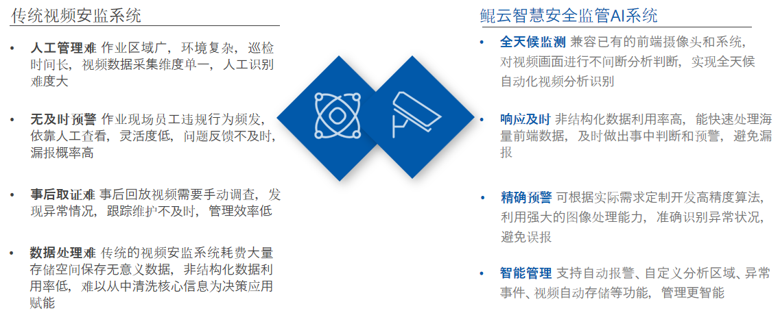 對比傳統(tǒng)視頻安監(jiān)系統(tǒng),鯤云智慧安全監(jiān)管AI平臺有以下幾點優(yōu)勢: