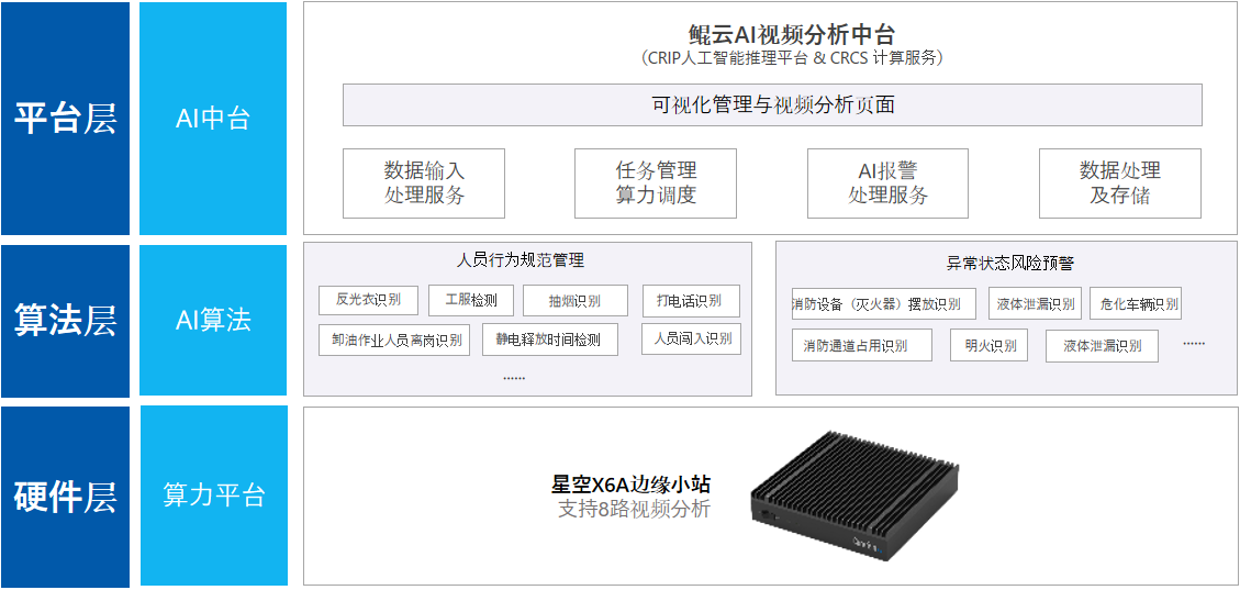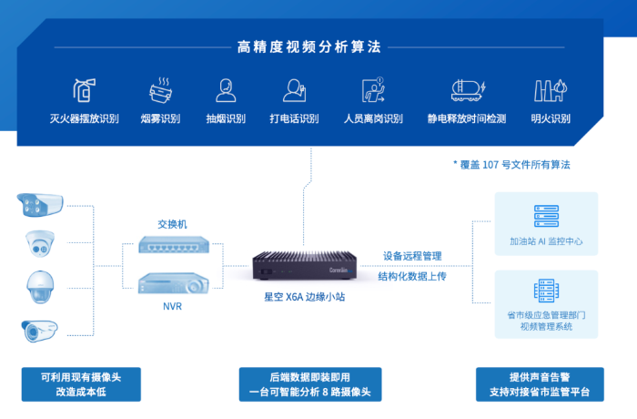 針對應急管理部門和客戶的實際需求,鯤云對該企業(yè)旗下加油站進行智能化改造升級,將加油站內(nèi)現(xiàn)有的攝像頭集成到鯤云提供的星空X6A邊緣小站及視頻分析平臺,實現(xiàn)加油站安全智能化管理。通過運用智能視頻分析技術(shù),對該加油站內(nèi)抽煙、打電話、人員離崗、明火煙霧、滅火器擺放、靜電釋放時間這7種風險風險進行實時檢測,并將識別結(jié)果通過平臺發(fā)送警報,并將結(jié)果實時同步至市級管理平臺。
