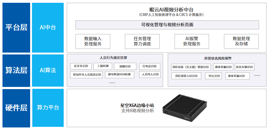 鯤云科技加油站AI智能檢測(cè)系統(tǒng),是通過(guò)1個(gè)邊緣盒子搭載7種AI算法連接加油站原有分析攝像頭,再將數(shù)據(jù)連通加油站AI分析中心,基于AI視頻分析技術(shù),打造出一套智能化加油站視頻分析系統(tǒng)??梢詫?shí)現(xiàn)對(duì)加油區(qū)和卸油區(qū)內(nèi)人員抽煙、打電話等違規(guī)行為,明火和煙霧等異常狀態(tài),卸油作業(yè)時(shí)人員離崗,滅火器未正確擺放,靜電釋放時(shí)間不足等不規(guī)范情形進(jìn)行24小時(shí)智能識(shí)別、語(yǔ)音報(bào)警和記錄,及時(shí)制止不安全行為。