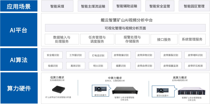 在煤礦行業(yè),為實(shí)現(xiàn)整個(gè)礦業(yè)少人、無(wú)人、高效、綠色的目標(biāo),根據(jù)礦監(jiān)局《煤礦及重點(diǎn)非煤礦山重大災(zāi)害風(fēng)險(xiǎn)防控建設(shè)工作總體方案》要求,鯤云科技推出了集深入行業(yè)場(chǎng)景的AI算法、自主研發(fā)的AI算力產(chǎn)品和視頻分析平臺(tái)為一體的智慧煤礦ai識(shí)別系統(tǒng)。