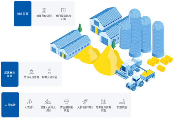 為解決糧食異動(dòng)、因水受潮、煙火等安全隱患,鯤云科技推出集監(jiān)測(cè)、分析、預(yù)警的智慧糧庫(kù)綜合管理平臺(tái)。基于人工智能視覺技術(shù),依靠自主研發(fā)的深度學(xué)習(xí)算法和高性能硬件產(chǎn)品,在糧庫(kù)原有的攝像頭上進(jìn)行賦能,利用倉(cāng)內(nèi)人數(shù)識(shí)別、倉(cāng)門開關(guān)識(shí)別、糧面異動(dòng)識(shí)別、煙霧火焰識(shí)別等AI算法,對(duì)攝像頭采集的圖像視頻進(jìn)行實(shí)時(shí)識(shí)別分析,確保糧食品質(zhì)安全。