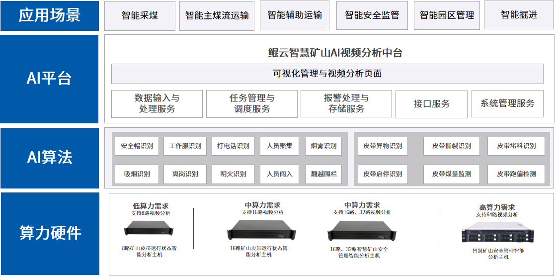 為加強礦山安全監(jiān)察能力,鯤云礦區(qū)安全識別系統(tǒng)基于人工智能視覺技術(shù),通過AI智能分析識別生產(chǎn)過程人機混合作業(yè)、三違作業(yè)管理、主煤流運輸與輔助運輸管理、皮帶機設(shè)備異常狀態(tài)等風(fēng)險,實時對地面和井下關(guān)鍵點位進(jìn)行監(jiān)測預(yù)警,助力礦業(yè)企業(yè)向智能化礦山轉(zhuǎn)型升級。