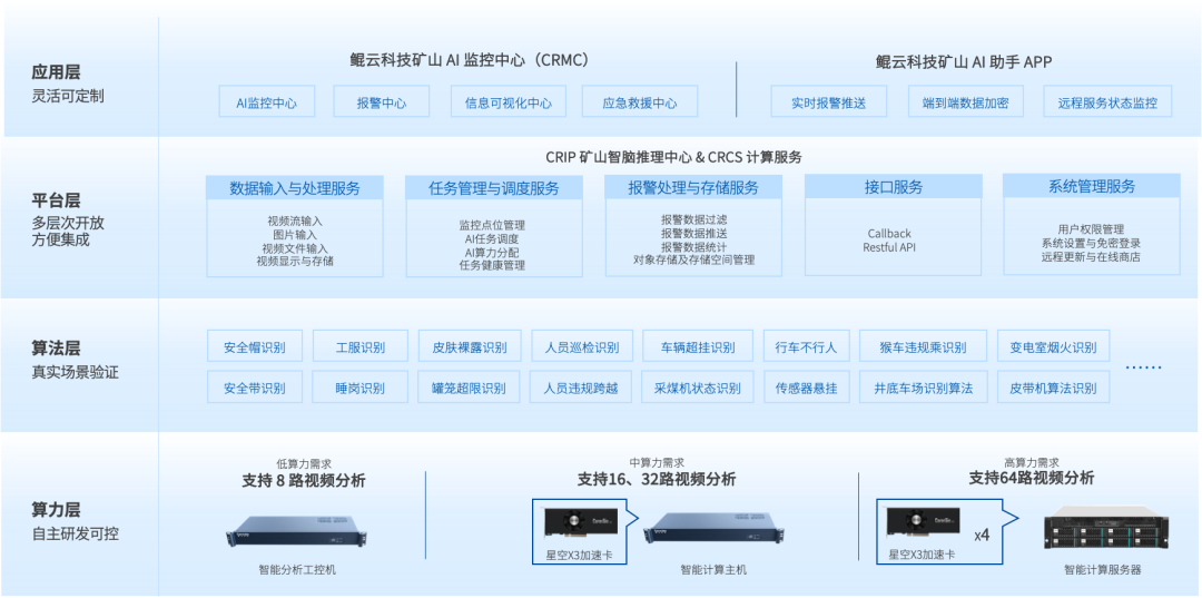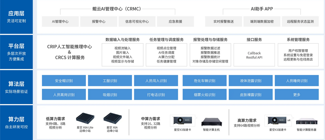 鯤云智能監(jiān)測系統(tǒng)采用充分利舊原則,利用AI邊緣分析設備連接前端攝像頭的邊緣部署方式,并連接AI監(jiān)管平臺和顯示終端形成一套完整的監(jiān)測系統(tǒng)。通過攝像頭采集實時畫面,并對畫面中的目標進行檢測和分析,并將數(shù)據(jù)傳輸?shù)紸I推理中心和管理終端對預警結果進行直觀展示,以實現(xiàn)對安全隱患的及時預警和處理。