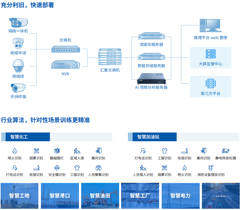 能源行業(yè):在能源行業(yè)中,視頻智能分析設(shè)備可以對(duì)加油站、油氣田、礦山等重要工作區(qū)域和工作設(shè)施進(jìn)行實(shí)時(shí)監(jiān)測(cè),一旦發(fā)現(xiàn)原油泄露、人員吸煙、明火等立即預(yù)警確保其安全運(yùn)行。