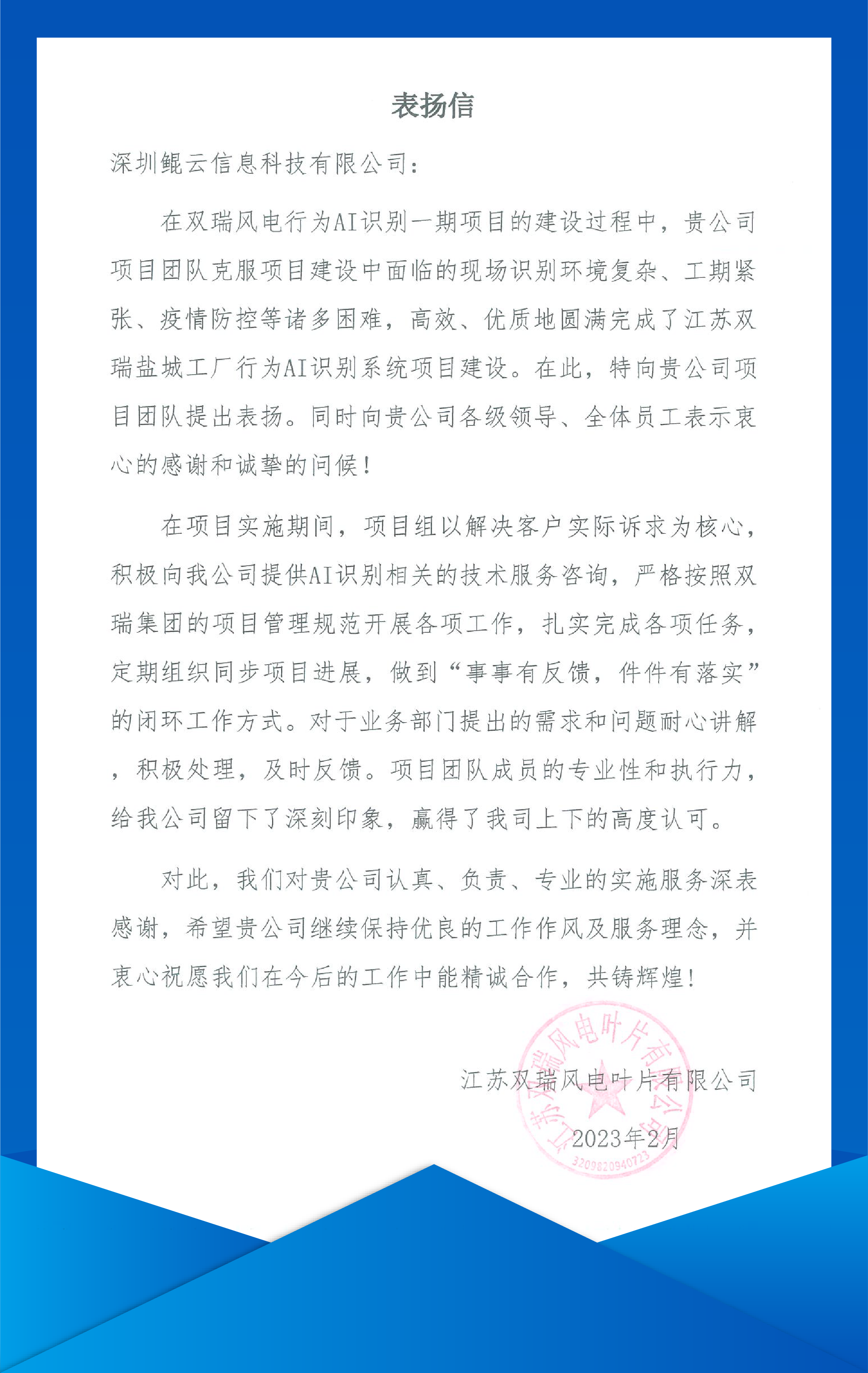 本次項目建設(shè)過程中,鯤云團(tuán)隊面臨識別環(huán)境復(fù)雜、工期緊張、疫情防控等諸多困難,仍然高效、優(yōu)質(zhì)地圓滿完成江蘇雙瑞鹽城工廠行為AI識別系統(tǒng)項目建設(shè),收到了來自雙瑞風(fēng)電的實名點贊。