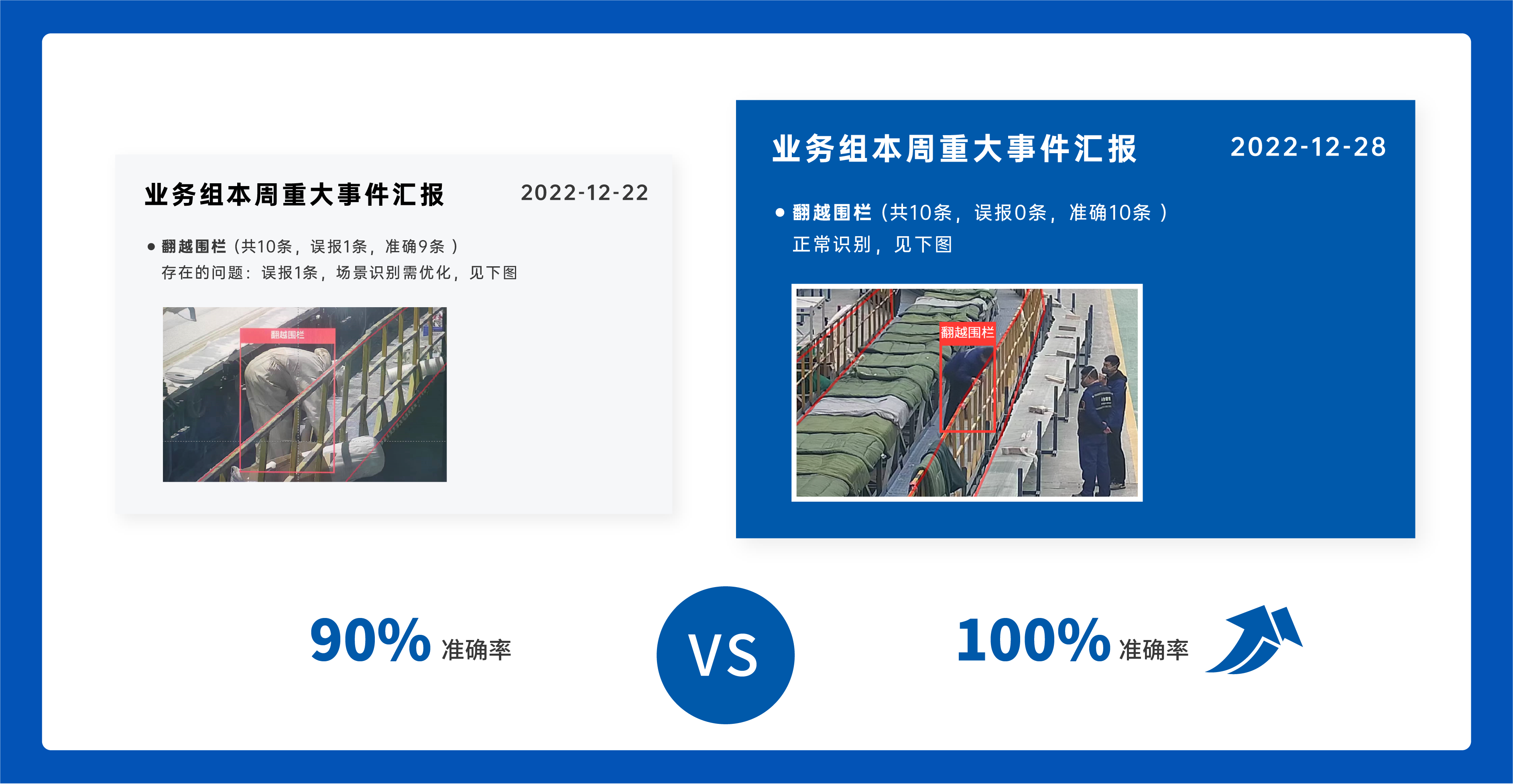 定制化算法從首次實測90.9%準(zhǔn)確率,到驗收時100%準(zhǔn)確率,在2022年年底全國嚴(yán)峻的疫情防控形勢下,鯤云AE團(tuán)隊只用了4周時間完成所有算法的效果優(yōu)化,并成功驗收。