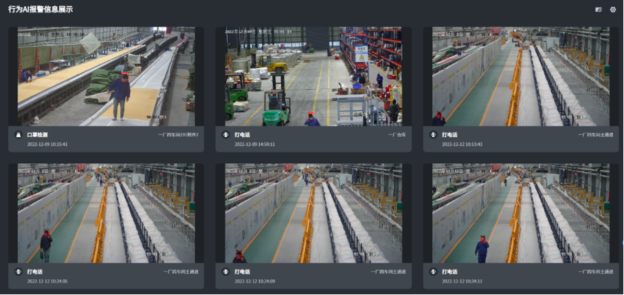 一期試點項目確認(rèn)在鹽城基地的成型車間、后處理車間、倉儲物流車間、化學(xué)品庫、危廢庫、垃圾場等場景根據(jù)管理需求部署未佩戴安全帽識別、未佩戴防塵口罩、打電話識別、攀爬欄桿作業(yè)識別、吊物作業(yè)下停留、煙火識別等鯤云通用AI算法。
